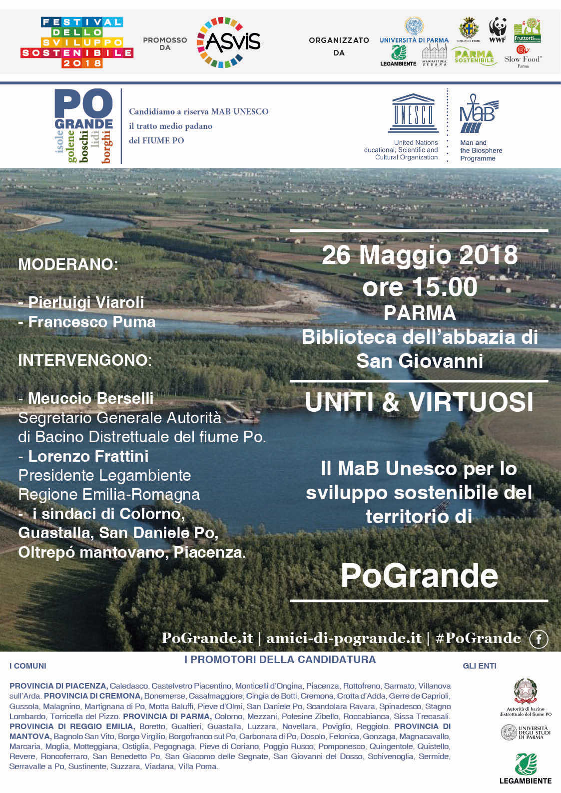 Parma, 22 Maggio 2018 – Uniti e virtuosi è il titolo dell’incontro volto ad illustrare nei dettagli la candidatura a Riserva MAB UNESCO del Medio Po nella città di Parma ma, in modo particolare, un focus tematico per approfondire il delicato tema dello sviluppo sostenibile e l’opportunità che essa può rappresentare per il tratto medio-padano del Grande Fiume.